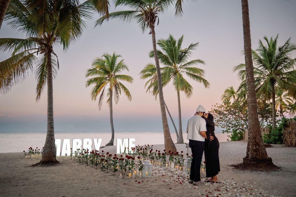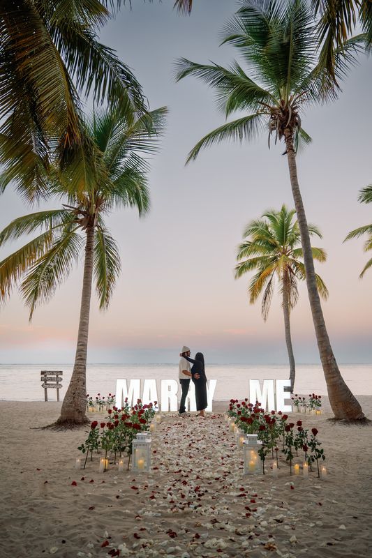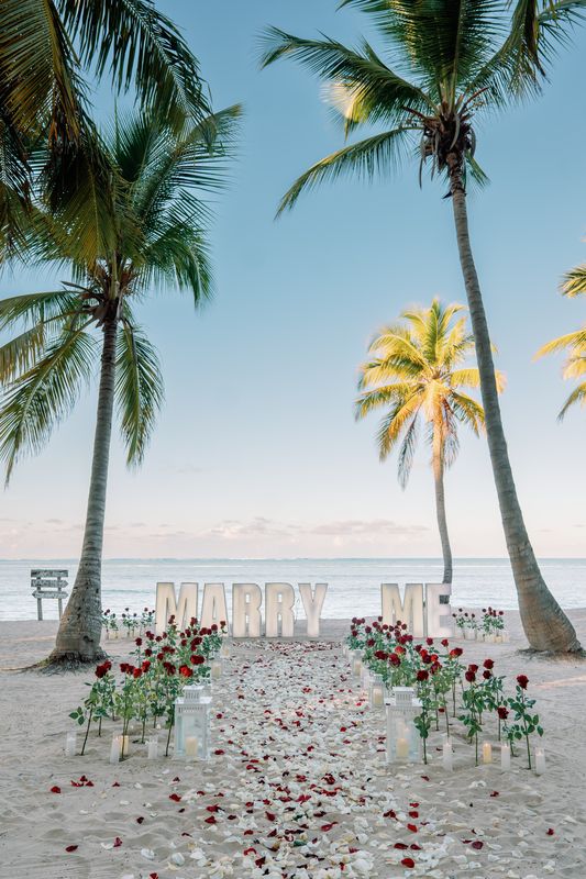 Предложение руки и сердца на пляже Пунта-Каны сочетает природную красоту, уединение и сильный эмоциональный эффект. Бирюзовый океан, белый песок и тропический закат создают исключительный фон. Более того, светящиеся буквы, лепестки роз, фонари и фейерверки превращают простой вопрос в кинематографичную историю любви.