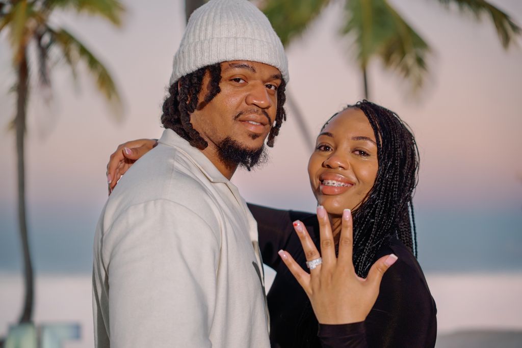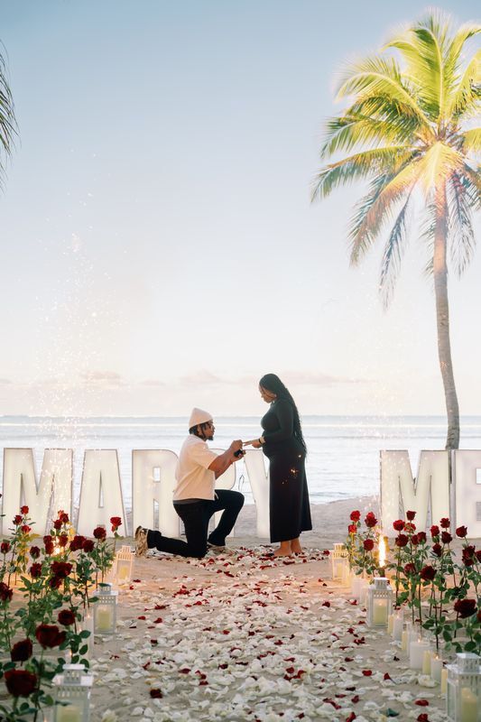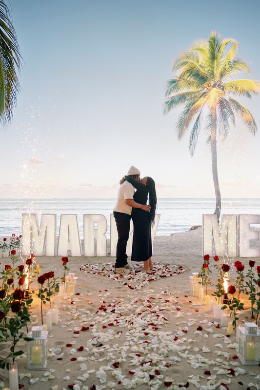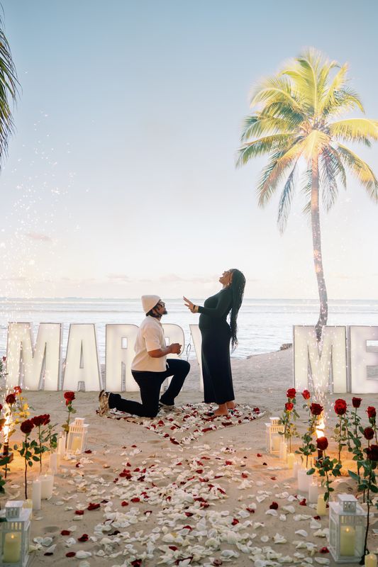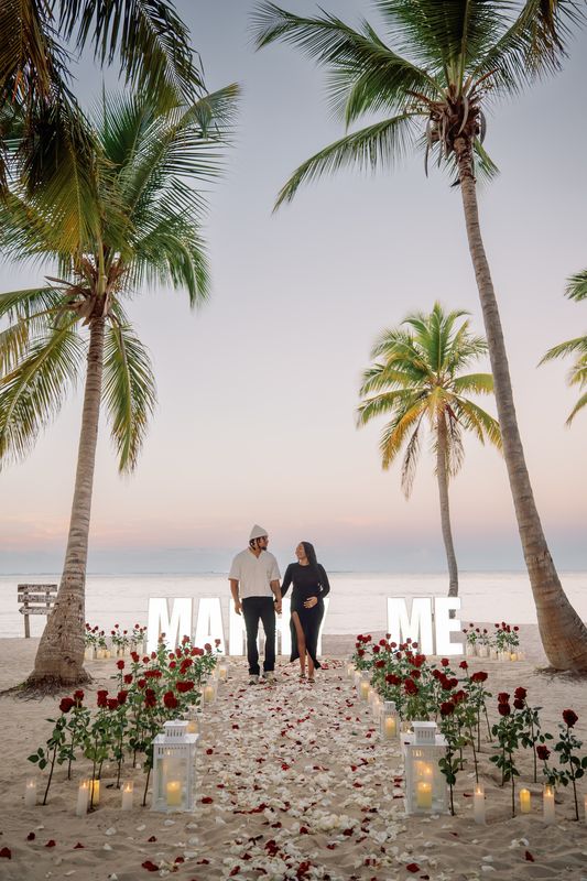 Предложение руки и сердца на пляже Пунта-Каны со светящимися буквами «MARRY ME»