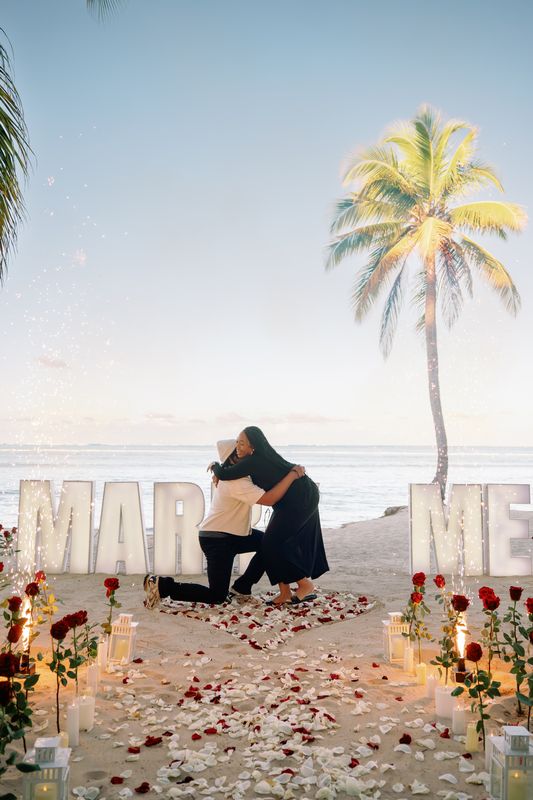 Затем он становится на одно колено внутри сердца из лепестков роз и задаёт самый важный вопрос в своей жизни. В тот же момент позади светящихся букв зажигаются искрящиеся фейерверки-фонтаны. Они создают эффектный и одновременно элегантный акцент, а океан отражает золотые искры на поверхности воды.