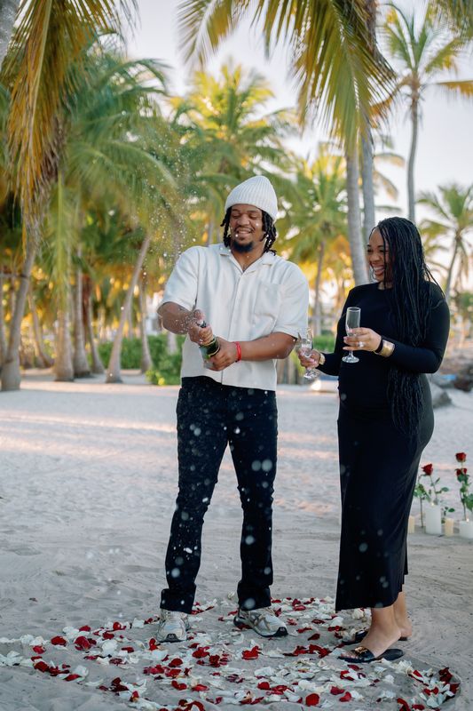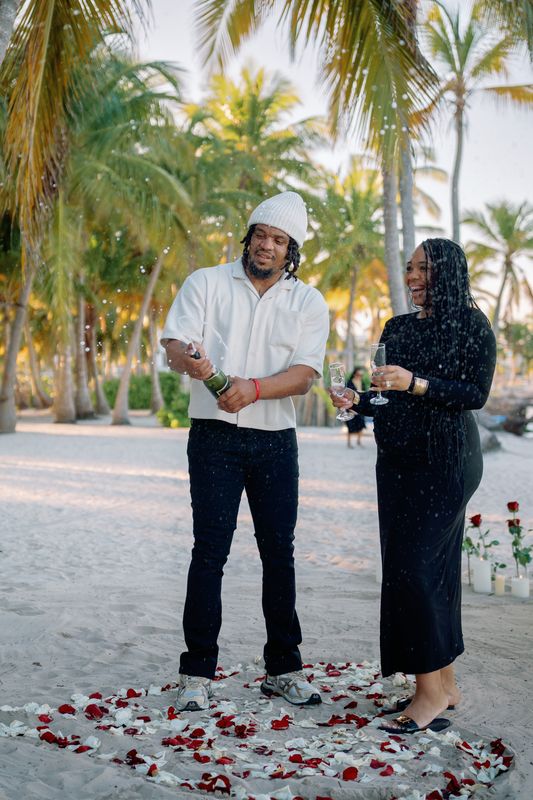 Профессиональный фотограф запечатлевает каждый этап этого предложения руки и сердца на пляже Пунта-Каны. От трепетного ожидания с повязкой на глазах до искрящихся фейерверков и первого поцелуя в статусе жениха и невесты — каждая деталь превращается в драгоценное воспоминание. Фотосессия продолжается вдоль линии прибоя, сохраняя магию этого вечера навсегда.
