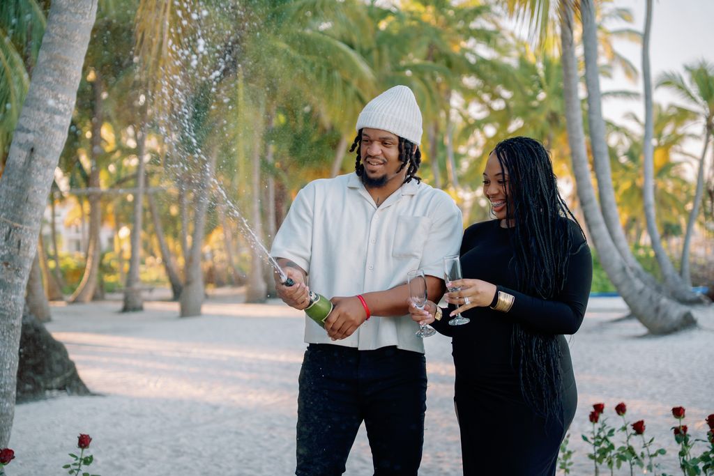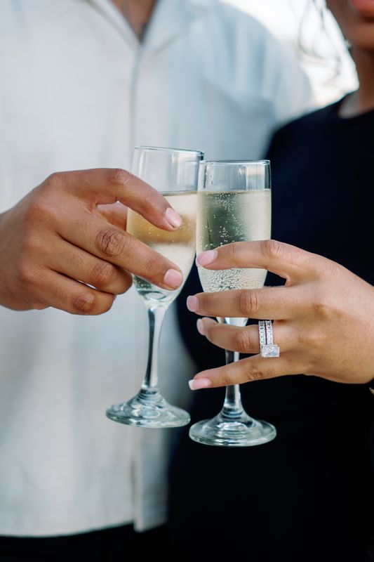 Сразу после предложения пара отмечает этот момент бокалом охлаждённого шампанского. Бокалы мягко соприкасаются, а волны продолжают свою романтическую мелодию. Радость, слёзы и смех сливаются в одно незабываемое мгновение.