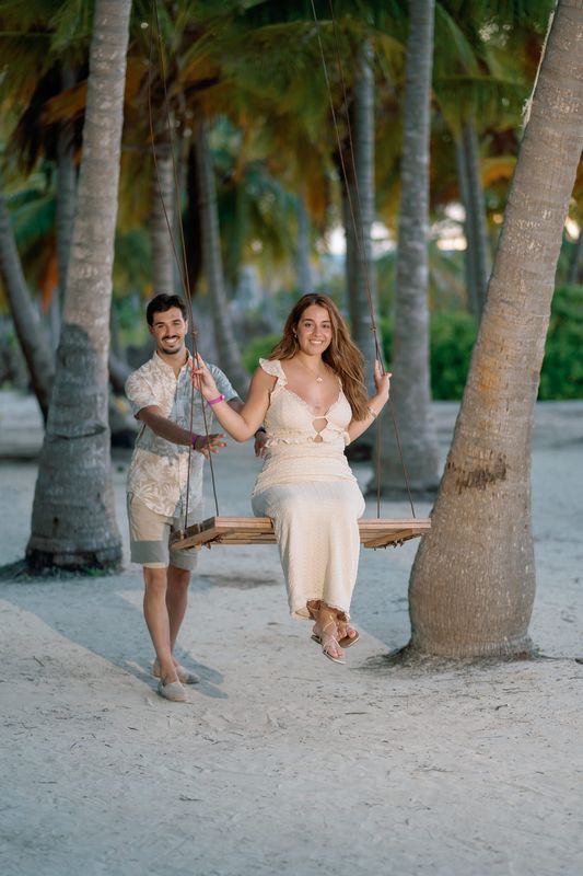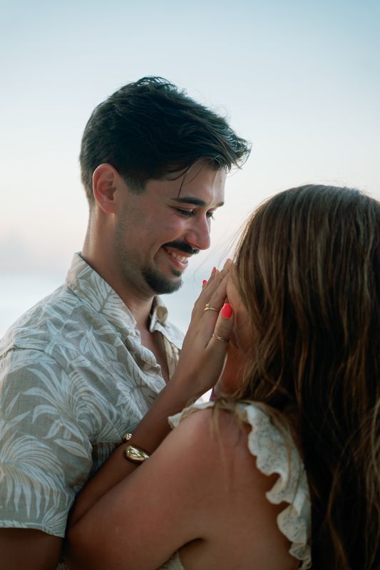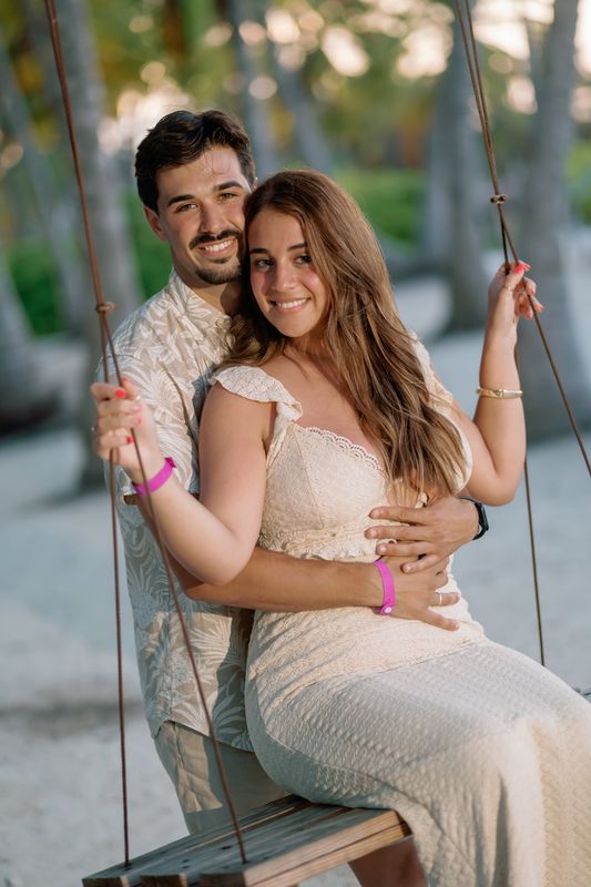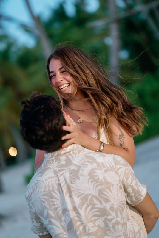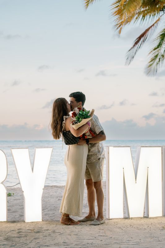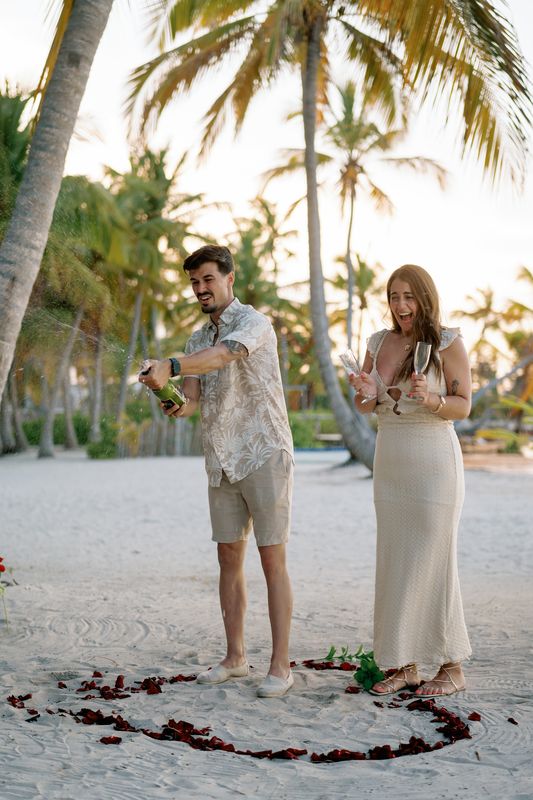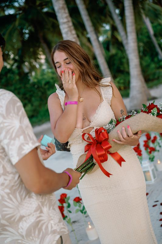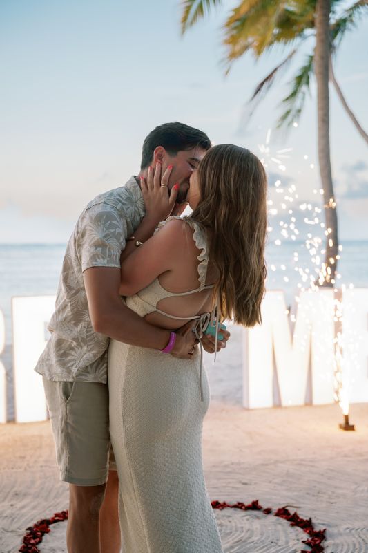 В этот момент молодой человек опустился на одно колено и задал самый важный вопрос в своей жизни. Она с радостью сказала «да», со слезами счастья на глазах. Мгновенно фонтаны фейерверков осветили пляж, наполняя сцену магией и праздником. Атмосфера была полна счастья, а их история любви открыла новую незабываемую главу.