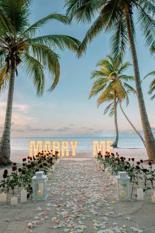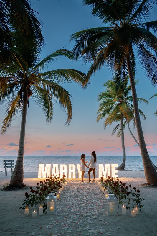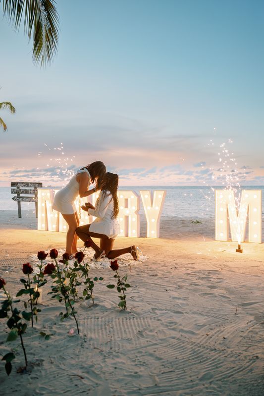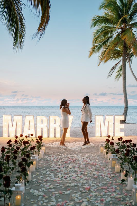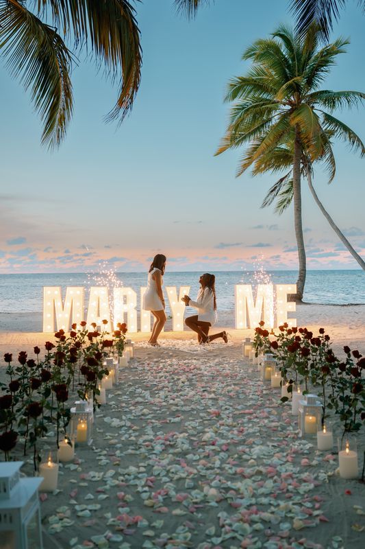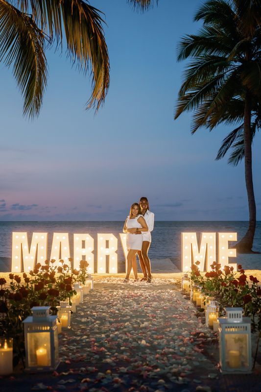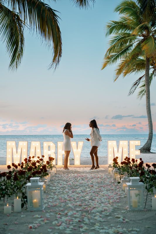 Планируете предложение руки и сердца однополой пары в Пунта-Кане? — это прекрасный способ отпраздновать любовь. На частном карибском пляже на закате одна девушка удивила свою партнёршу волшебной подготовкой. Мягкий песок был украшен розами, а романтическая дорожка из лепестков вела к светящейся надписи «MARRY ME». Большое сердце из лепестков роз завершало эту захватывающую сцену.