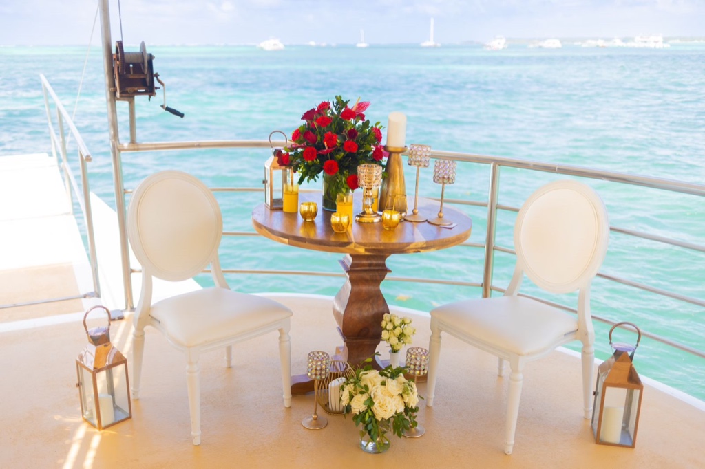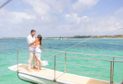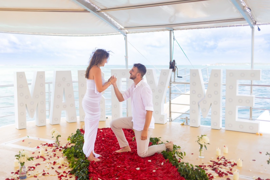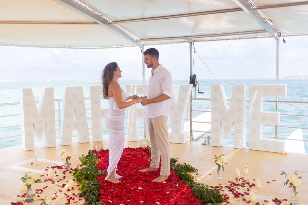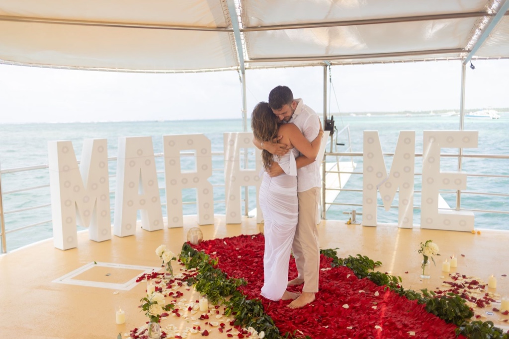 Отправьтесь в романтическое плавание с нашим «Предложением на катамаране», небесное путешествие по лазурным водам Пунта-Каны, Доминиканская Республика. Когда солнце садится, окрашивая небо тёплыми оттенками, знак «MARRY ME» гордо стоит на палубе.