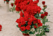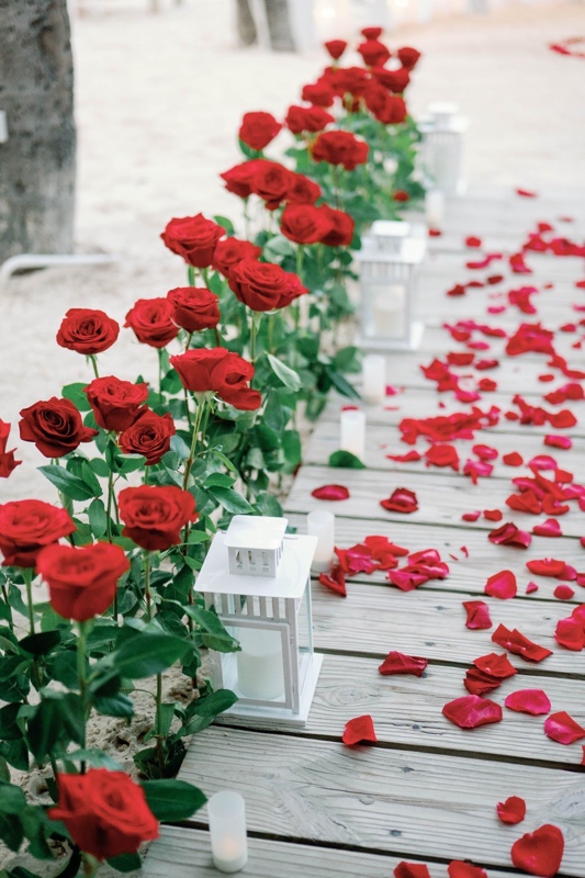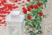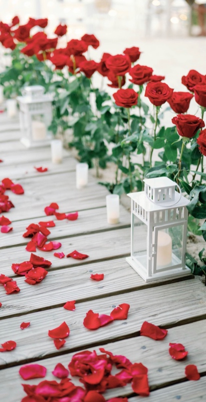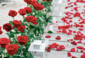 - Оформленная зона с зажжёнными свечами, великолепная арка-сердце из белых или красных роз (шёлковые цветы), красные или белые розы вдоль аллеи (смесь искусственных и свежих роз)