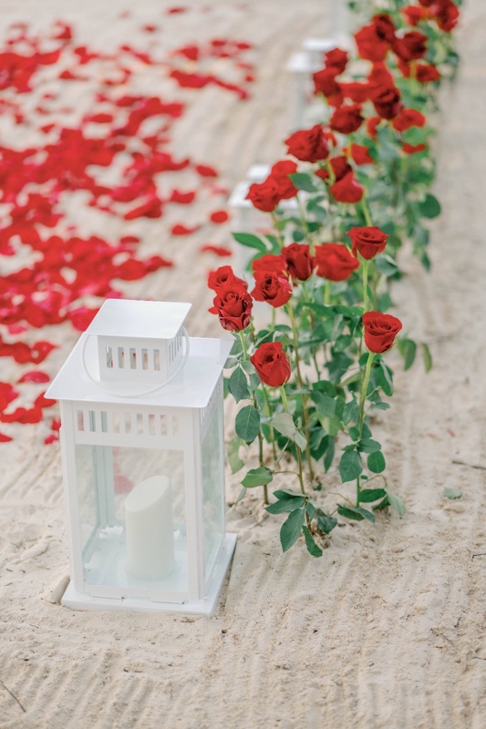 - Оформленная зона с зажжёнными свечами, красивый знак «MARRY ME» с огнями и свечами, настоящие красные розы вдоль аллеи к знаку