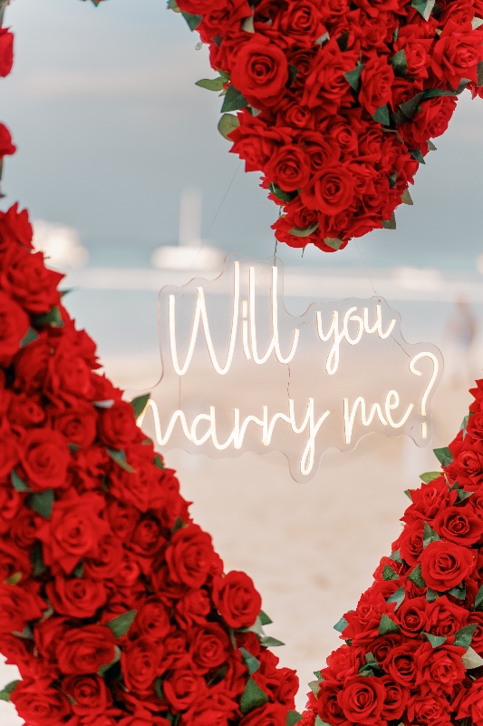 Знак «MARRY ME» — $250, LED-знак «Will you marry me?» на вершине арки — $150, букет свежих цветов — $80
