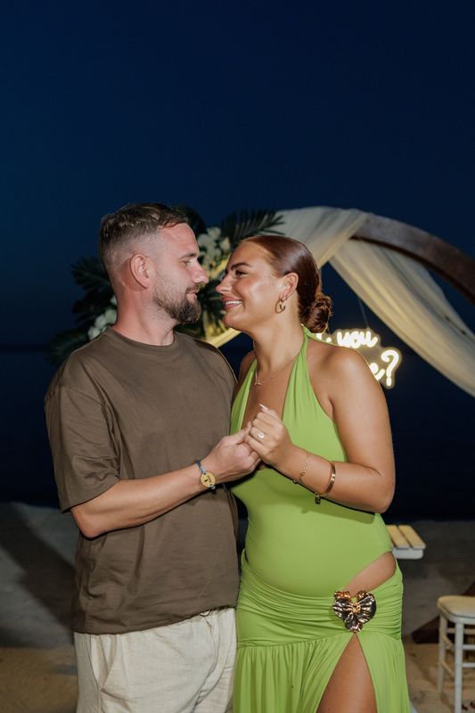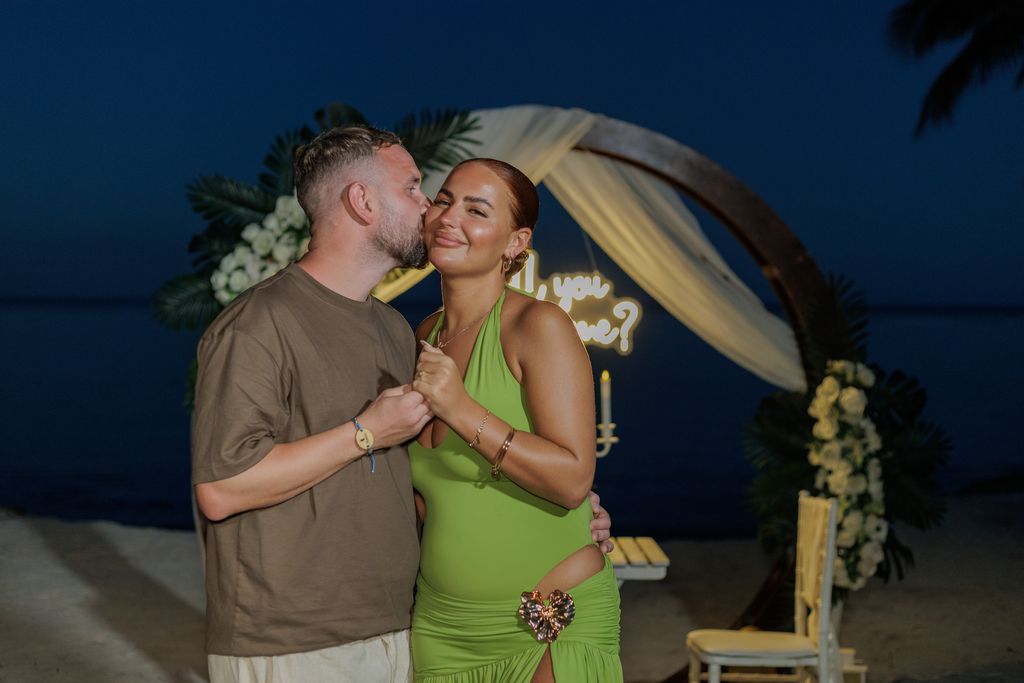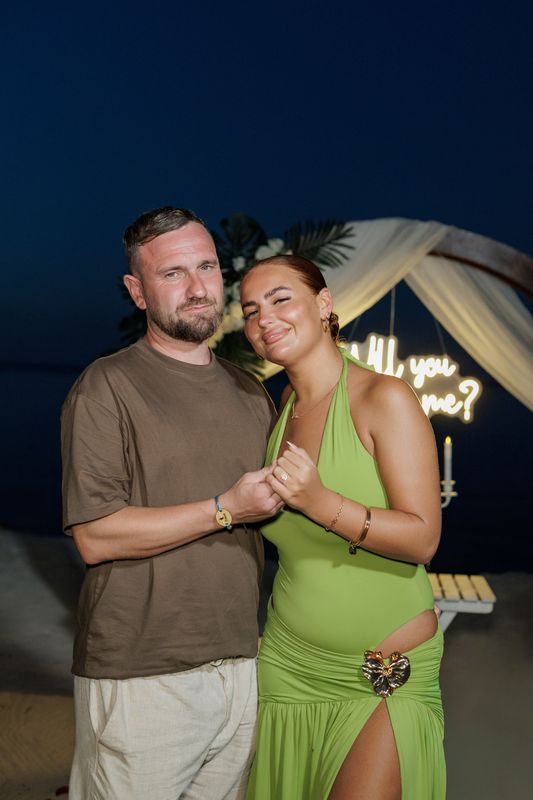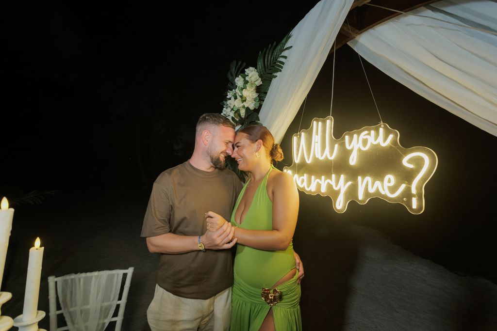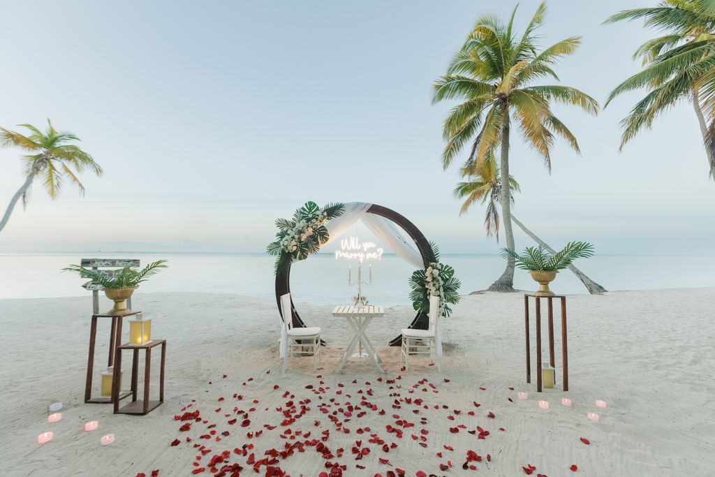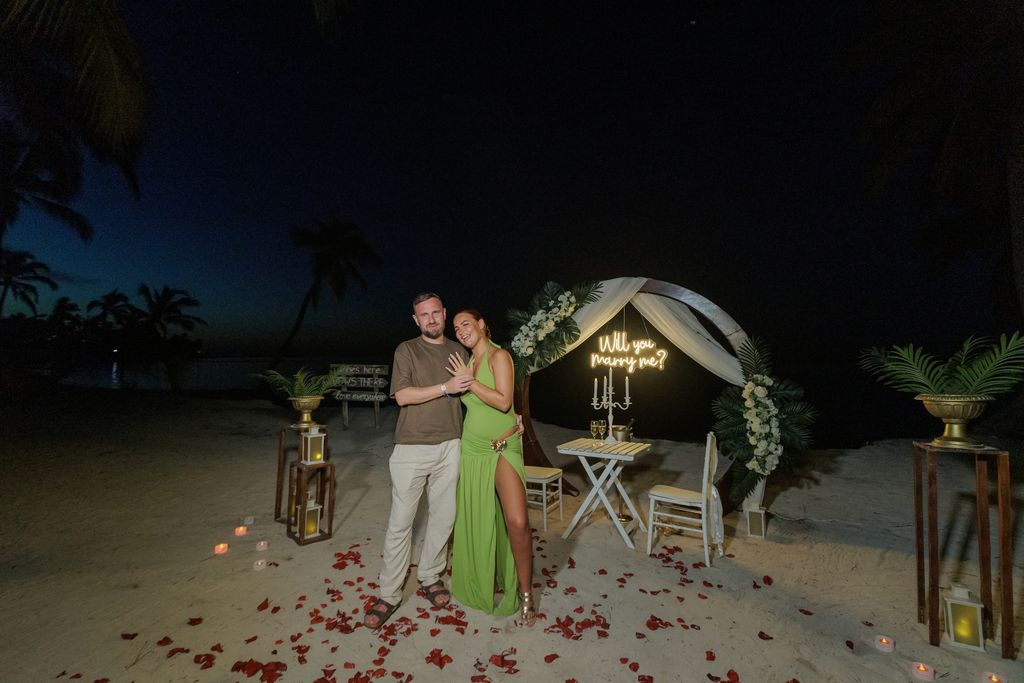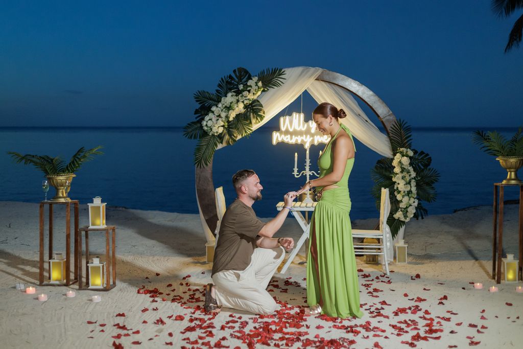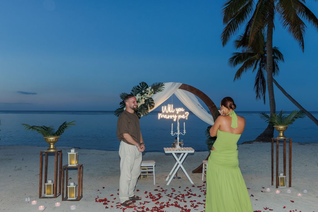 Перед аркой наступает момент, который невозможно забыть. Тёплые лучи заката освещают пляж, лёгкий морской бриз ласкает кожу. В центре арки горит надпись «Will You Marry Me?». Этот пейзаж создаёт трогательную и интимную атмосферу — именно такую, о которой мечтает каждая пара в день предложения.